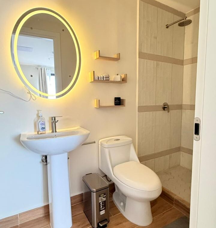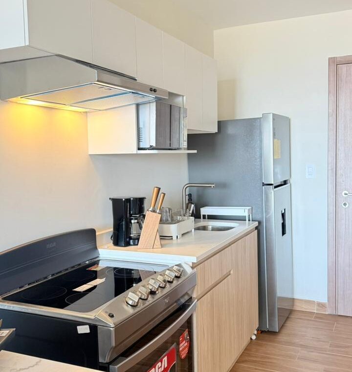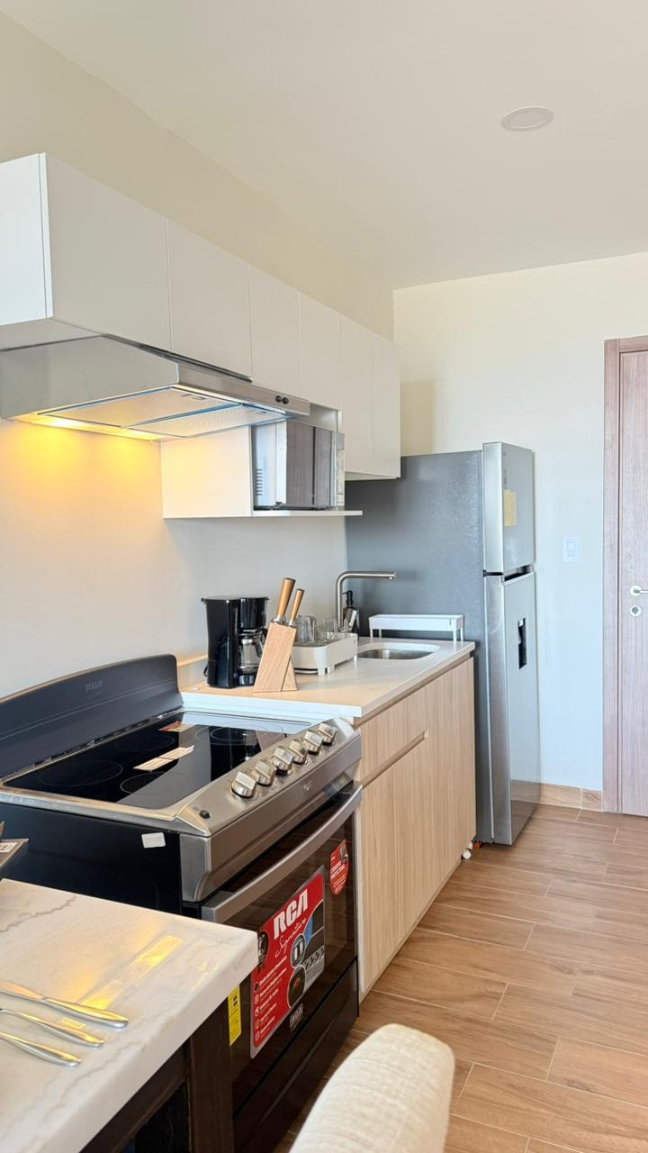 - Características: Sala, comedor, cocina con top de cuarzo, 1 habitación, estudio, 1 baño, 1 estacionamiento