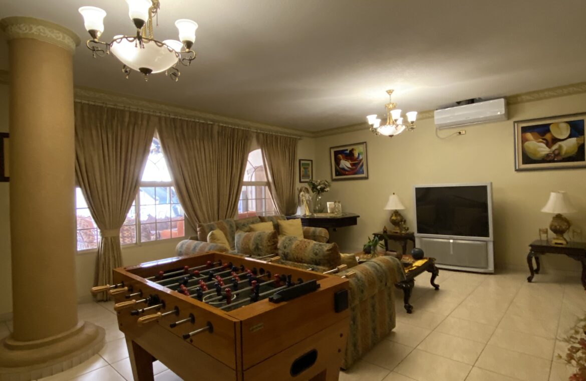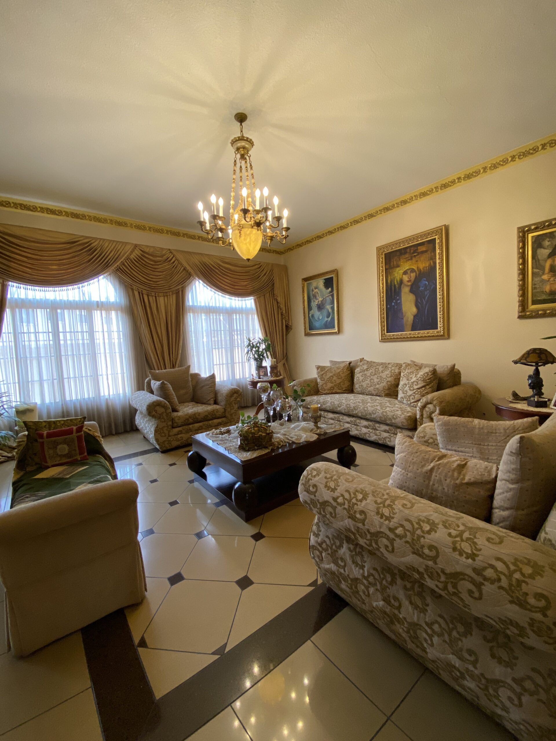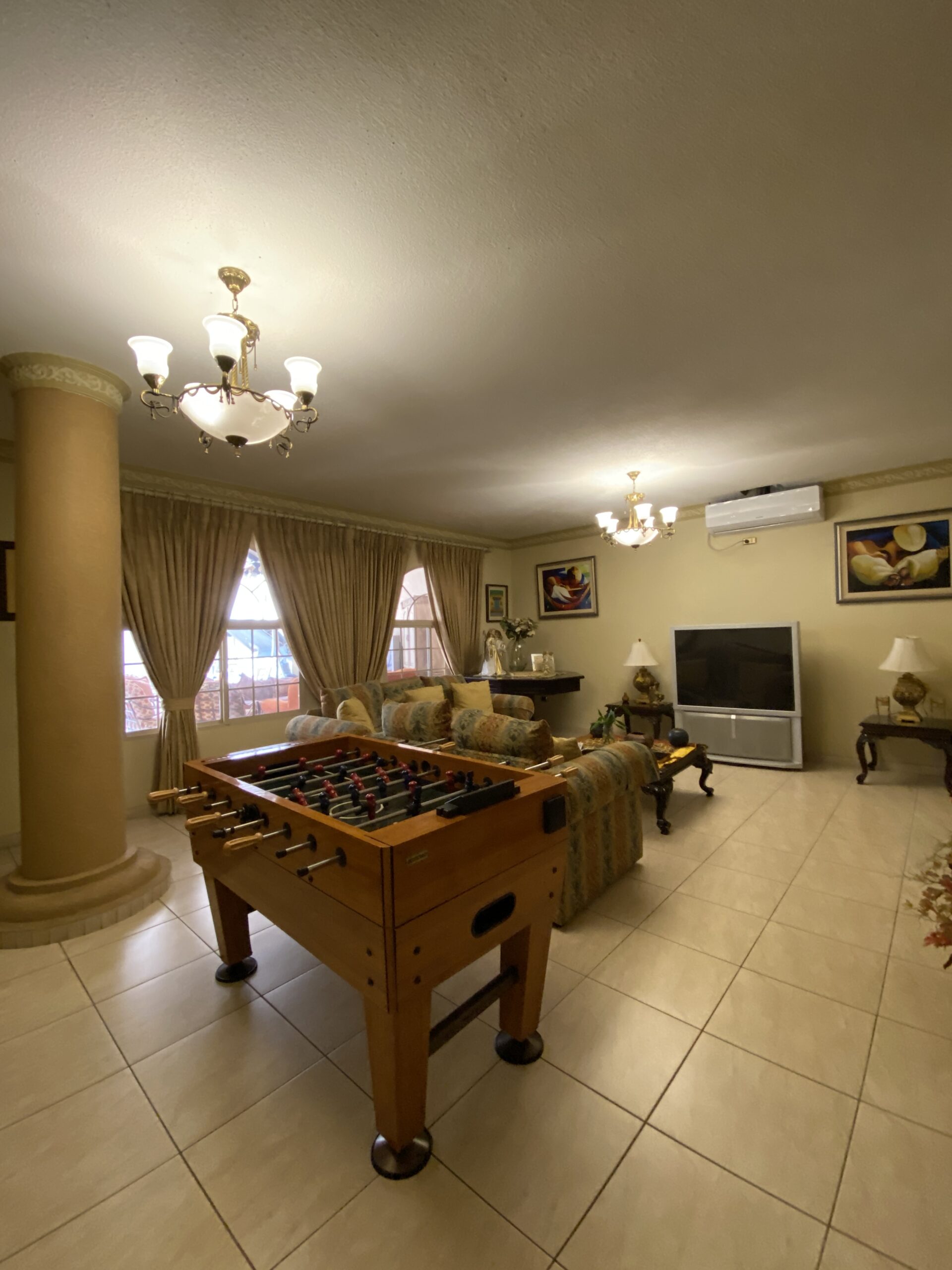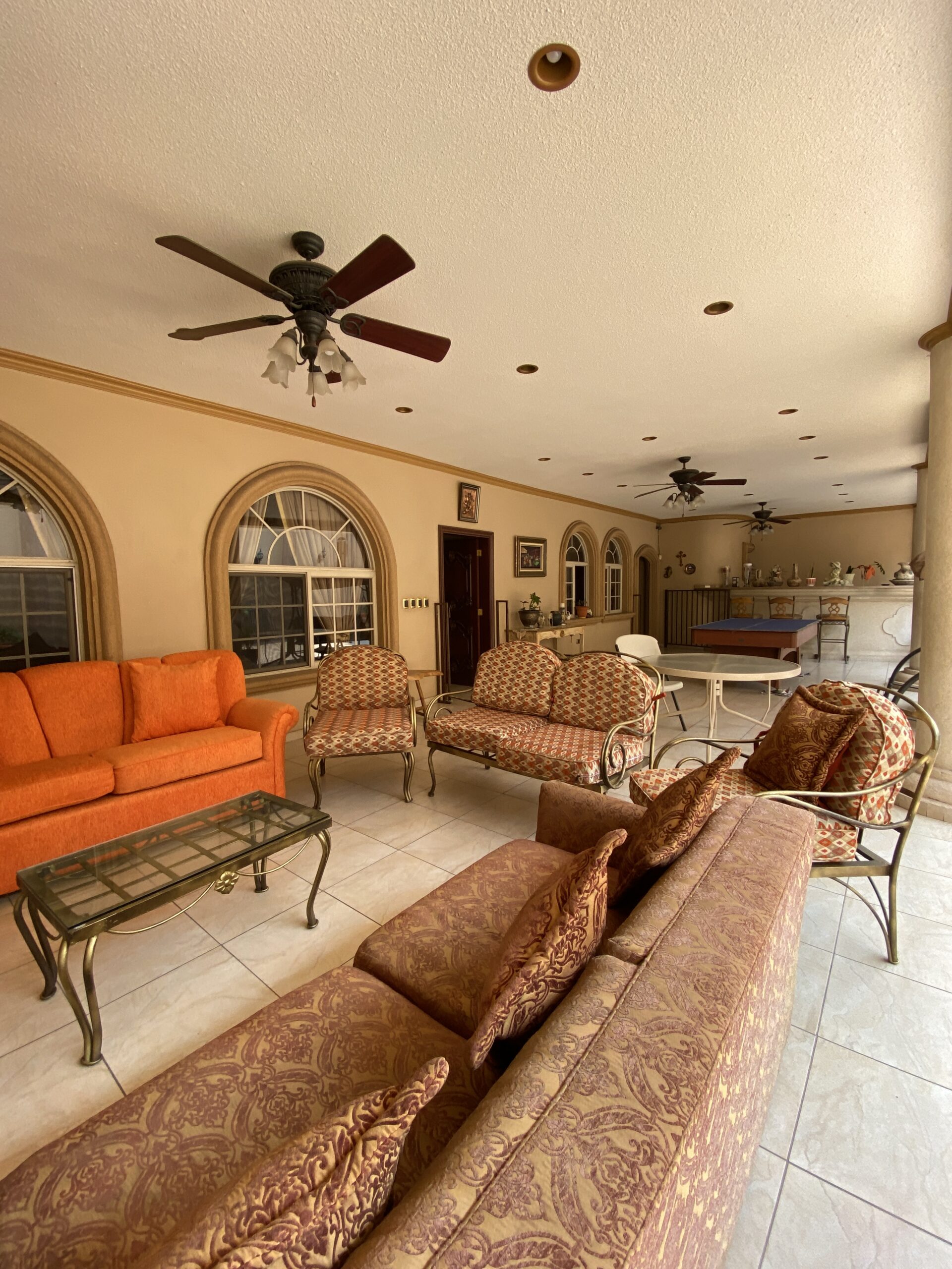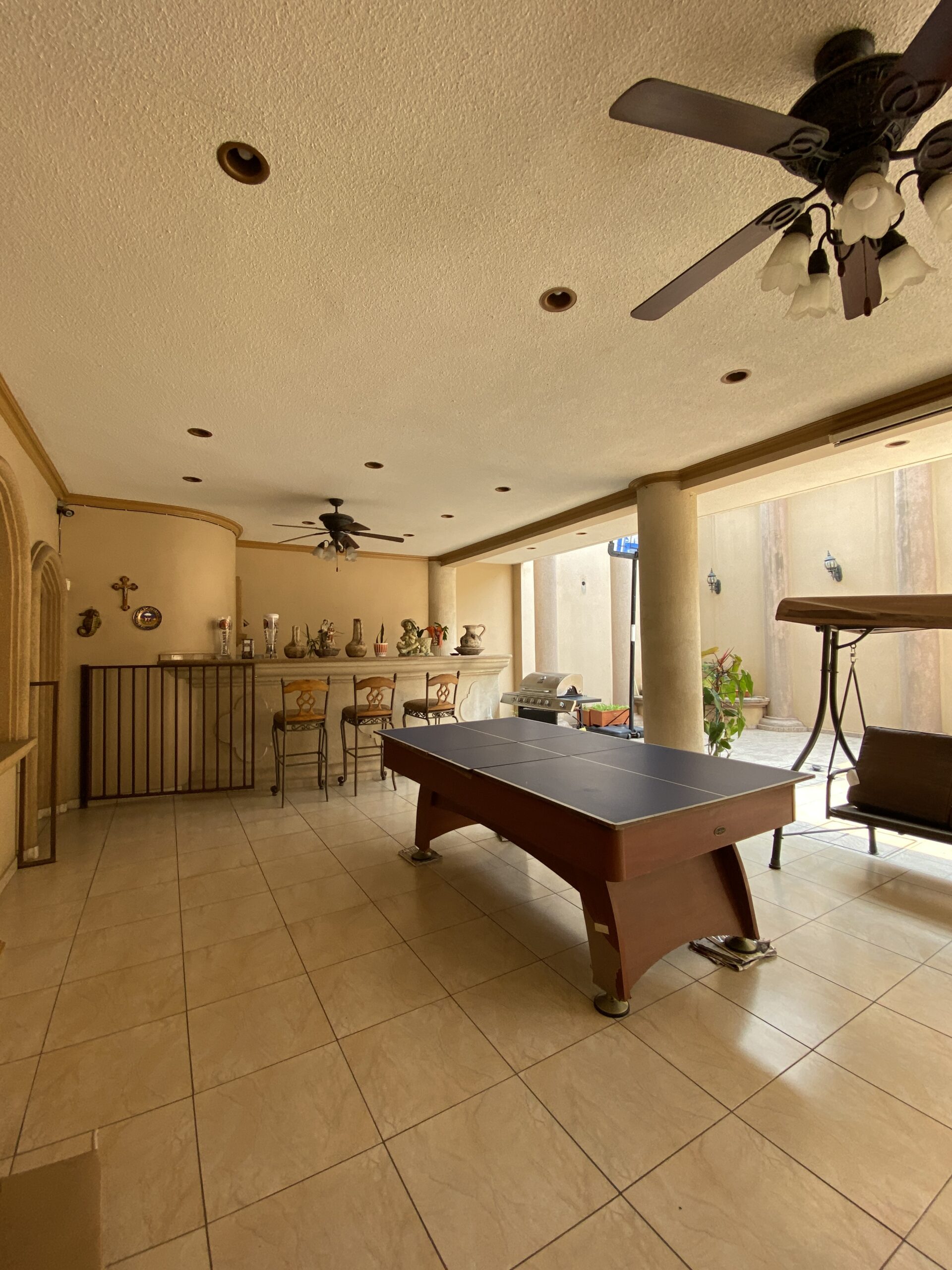 •Características: Puertas altas de caoba, recibidor, estudio con mueble, antesala con mueble, sala principal con lampara de alabastro, comedor, puertas de cocina con vitrales, cocina amplia top de granito, desayunador, alacena, baño de visita, sala familiar con terraza, habitaciones con sus vestidores y baños, habitación principal con jacuzzi, bodega, salón de juegos, estudio, terraza social con area de barbacoa, cuarto de huésped con baño completo y estacionamiento.