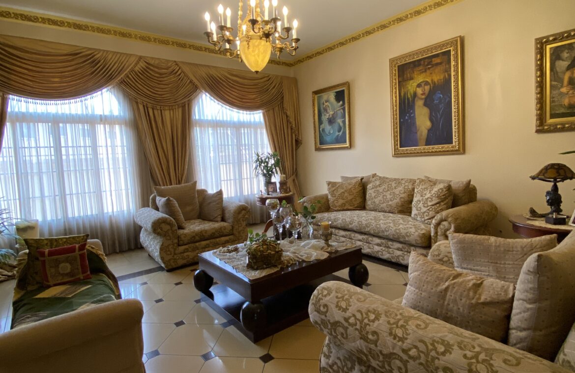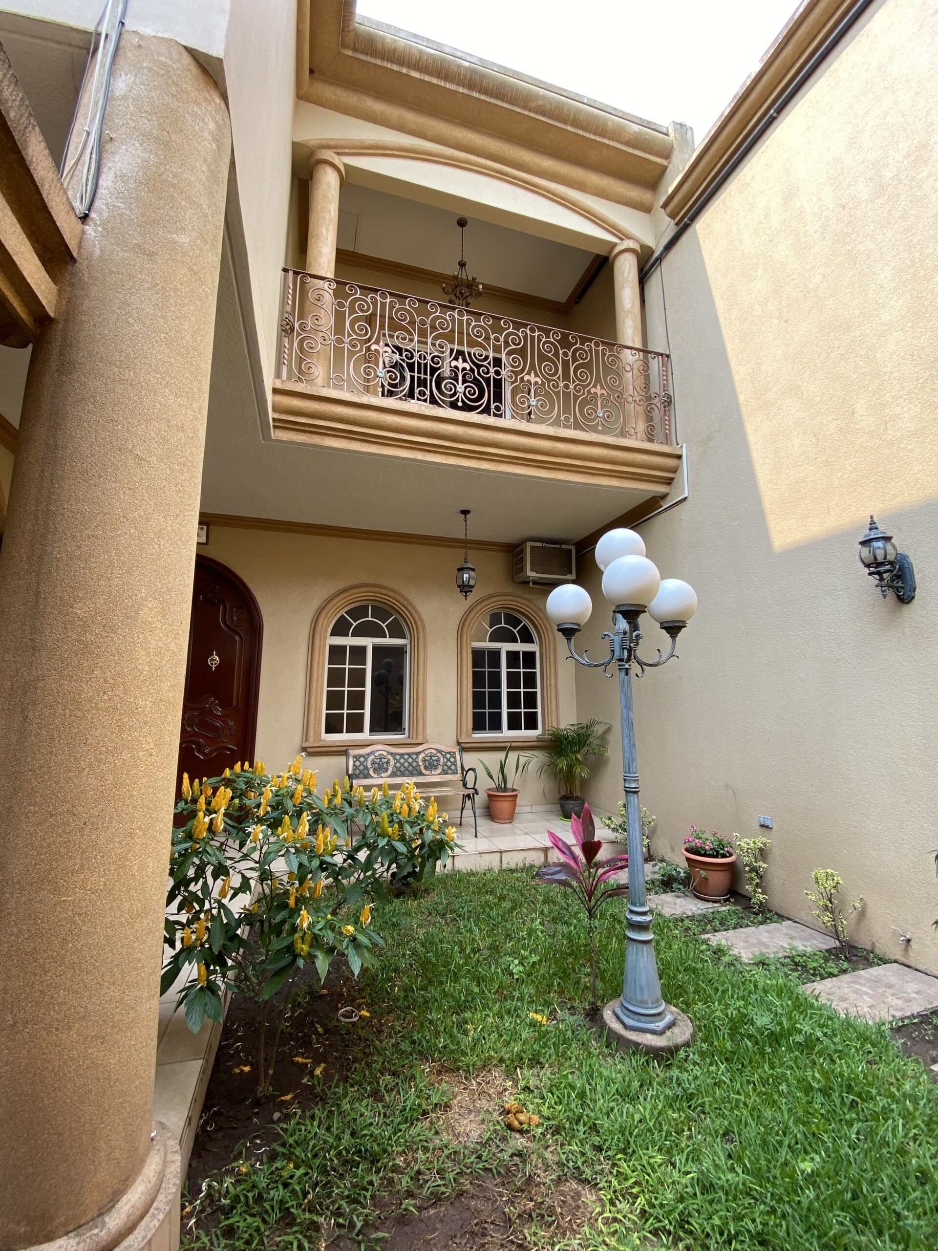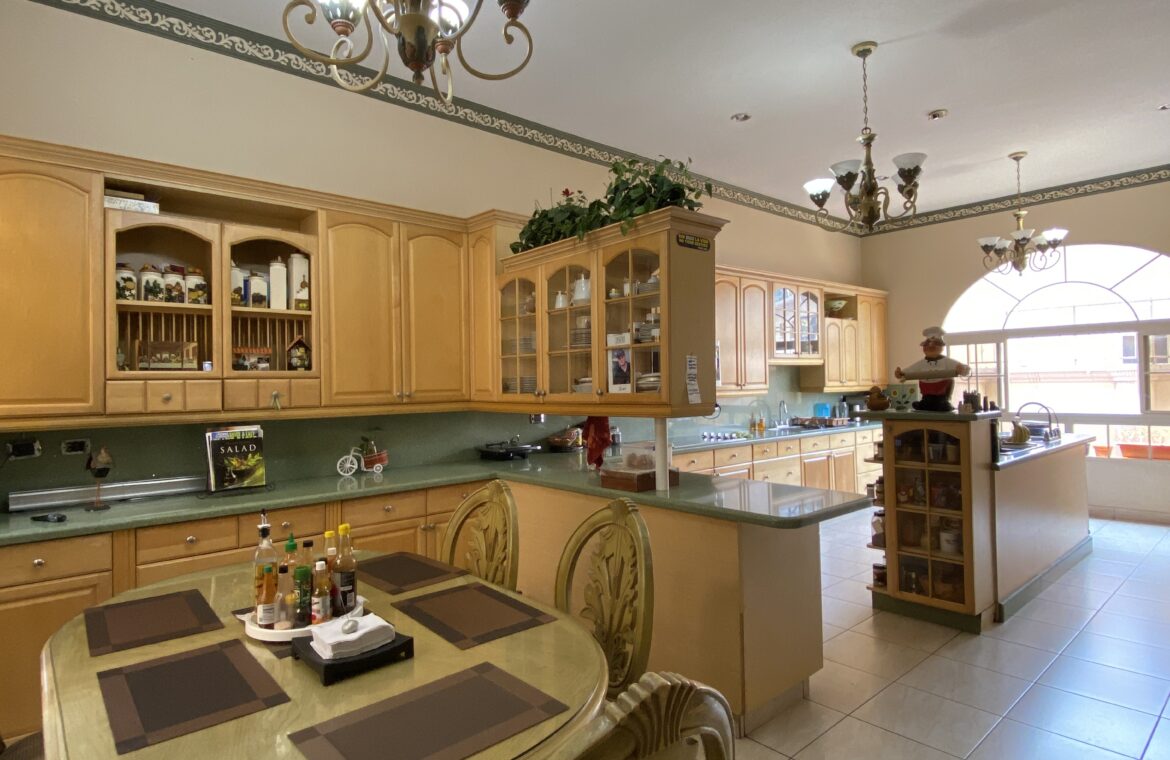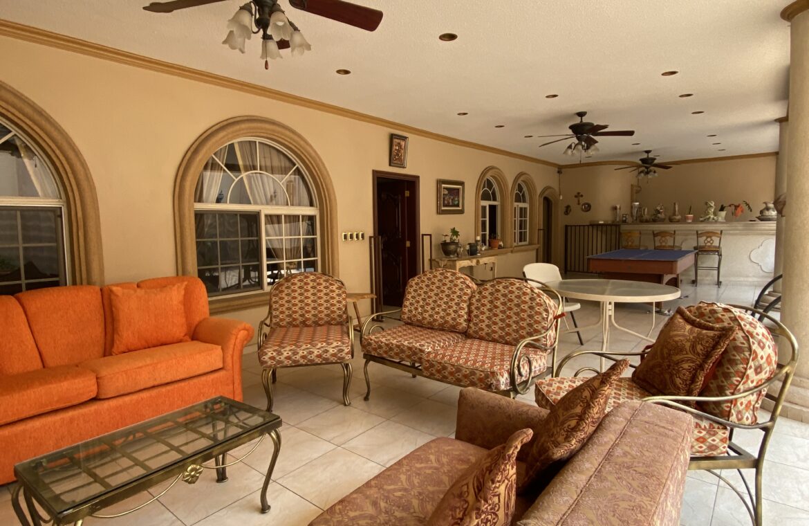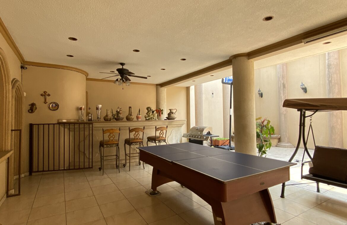 •Características: Puertas altas de caoba, recibidor, estudio con mueble, antesala con mueble, sala principal con lampara de alabastro, comedor, puertas de cocina con vitrales, cocina amplia top de granito, desayunador, alacena, baño de visita, sala familiar con terraza, habitaciones con sus vestidores y baños, habitación principal con jacuzzi, bodega, salón de juegos, estudio, terraza social con area de barbacoa, cuarto de huésped con baño completo y estacionamiento.